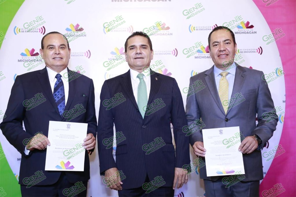 Morelia, Michoacán, a 1 de abril de 2019.- El Gobernador Silvano Aureoles Conejo, presentó formalmente este lunes a Carlos Herrera Tello y José Martín Godoy Castro, como nuevos titulares de las Secretarías de Gobierno y de Seguridad Pública, respectivamente.