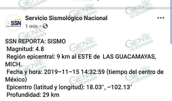 Un sismo de 4.8 grados en la escala de Richter, ocurrió a eso de las 14:32 horas con 59 segundos de este viernes, y tuvo su epicentro a 9 kilómetros al Este de la tenencia de Guacamayas municipio de Lázaro Cárdenas, y a una profundidad de 29 kilómetros, según datos del Servicio Meteorológico Nacional.