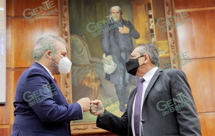 Morelia, Michoacán, 17 de febrero del 2022.- El gobernador Alfredo Ramírez Bedolla acompañó al magistrado presidente del Supremo Tribunal de Justicia y del Consejo del Poder Judicial de Michoacán, Héctor Octavio Morales Juárez, a la presentación de su tercer y último informe de actividades correspondiente al 2021.