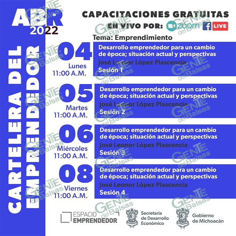 Morelia, Michoacán, 4 de abril del 2022.- Para el mes de abril, la Secretaría de Desarrollo Económico (Sedeco) ha preparado una cartelera de capacitación integrada por 13 charlas virtuales sobre temas diversos como emprendimiento, propiedad intelectual y economía digital.