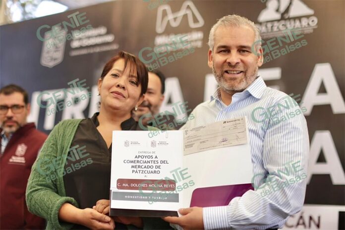 Pátzcuaro, Michoacán, 12 de julio 2023.- El gobernador Alfredo Ramírez Bedolla entregó los primeros 258 apoyos económicos a comerciantes reubicados del mercado municipal de Pátzcuaro, para coadyuvar con los gastos generados durante el proceso de traslado de mercancías, mobiliario y otros.