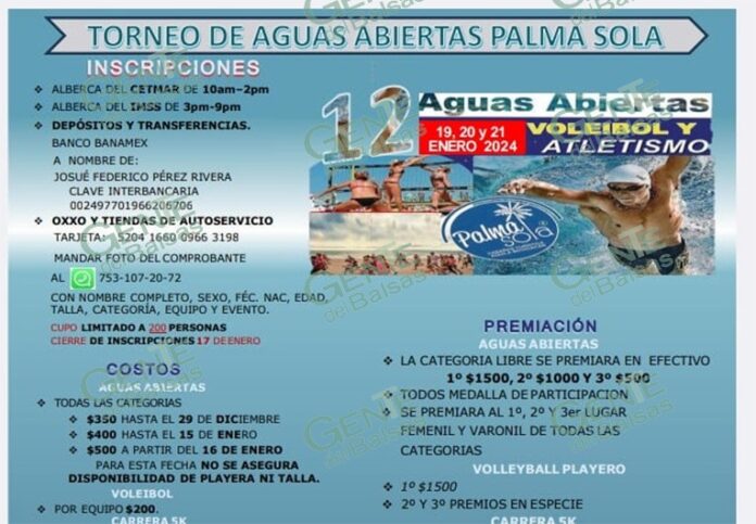 Quien se inscriba antes del 15 de enero, tendrá playera aunque para asegurarla debe anotarse cuanto antes, y para facilitar este proceso, se puede aquí en Lázaro Cárdenas, en la alberca del IMSS de 3 de la tarde a 9 de la noche y en la alberca del Cetmar de 10 de la mañana a 2 de la tarde. O con depósito o transferencia en Banamex a nombre de Josué Federico Pérez Rivera, cuenta interbancaria 002497701966206706 y desde alguna tienda de autoservicio a la tarjeta 5204166009663198.
