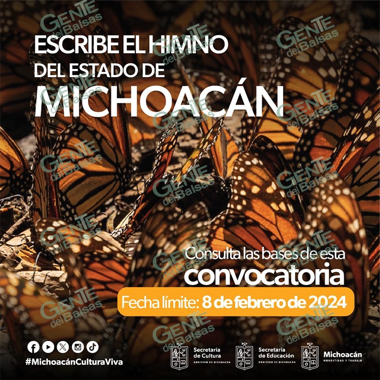 Morelia, Michoacán, 8 de enero de 2024.- No te quedes fuera y participa en la convocatoria para escribir del himno de Michoacán, que extiende su fecha límite hasta el próximo 8 de febrero, como parte de las festividades por el Bicentenario del estado, que realizará el Gobierno estatal en este 2024.