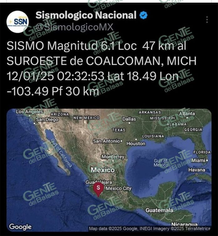 Morelia, Michoacán, 12 de enero de 2025.- Tras el sismo de magnitud 6.1 registrado al suroeste de Coalcomán, la Coordinación Estatal de Protección Civil realizó monitoreos en las regiones afectadas.