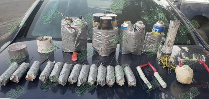 Los policías al revisar una mochila que portaban descubrieron los artefactos explosivos tipo dinamita con mecha y cinco artefactos en botella de aerosol, un recipiente con mechas y dos artefactos tipo cilindro tipo pirotecnia.