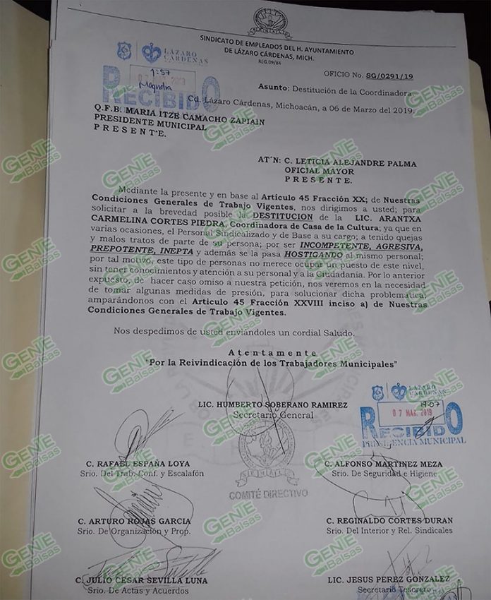 El Sindicato de Trabajadores al Servicio del Ayuntamiento de Lázaro Cárdenas, que dirige Humberto Soberano Ramírez, mediante oficio del pasado 6 de marzo, enviado a la alcaldesa María Itzé Camacho Zapiain, le solicita la remoción o destitución de la titular de la Casa de la Cultura “José Vasconcelos” de este lugar, Arantxa Carmelina Cortés Piedra, a quien acusan de ser inepta, incompetente y agresiva con los trabajadores sindicalizados, de base o eventuales.