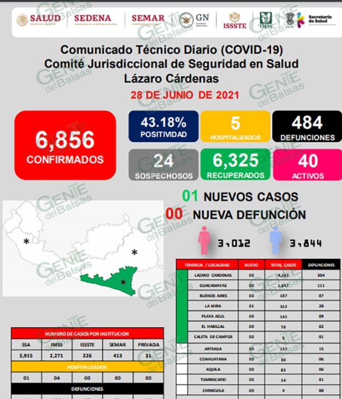 De acuerdo con el reporte técnico emitido la noche de ayer lunes por el Consejo Estatal de Seguridad en Salud, el municipio de Lázaro Cárdenas reportó un solo caso positivo de COVID-19 en las últimas 24 horas, para llegar a un acumulado de 6,599.