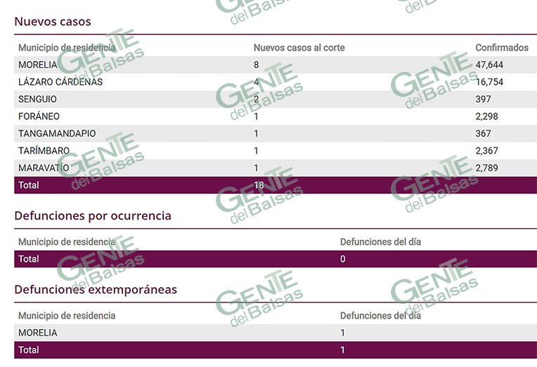 Por municipios, Morelia registró 8 nuevos contagios positivos para 47,644, Senguio dos para 397, Maravatío uno para 2,789, Tarímbaro uno para 2,367, Tangamandapio uno para 367 y el restante fue considerado como caso foráneo.