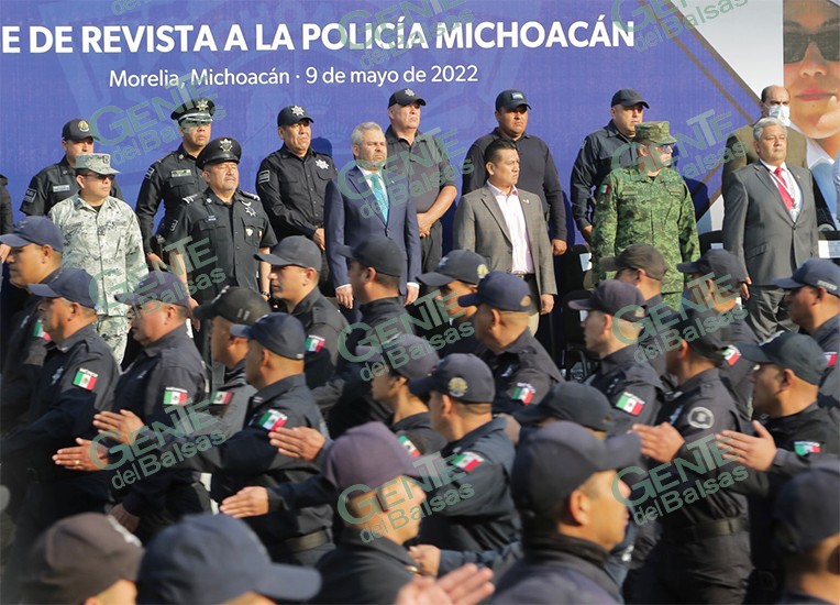 Morelia, Michoacán, 09 de mayo del 2022.- Bajo el compromiso de mejorar las condiciones de los elementos de seguridad pública, así como de trabajar en la protección de las mujeres y comunidades indígenas, para generar un nuevo paradigma de la seguridad, el gobernador, Alfredo Ramírez Bedolla, encabezó el pase de revista a los agrupamientos que conforman la Policía Michoacán.