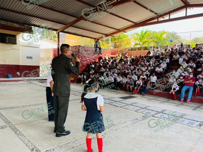 El pasado viernes, personal del 82 Batallón de Infantería del Ejército Mexicano, continuó con una serie de conferencias en escuelas primarias del municipio, para que no solamente los alumnos, sino también el personal docente y administrativo de esas instituciones, refuercen su conocimiento y respeto hacia nuestros Símbolos Patrios, como es la Bandera y el Escudo Nacional.