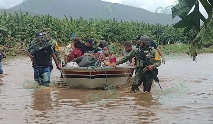 Coahuayana, MIch., 11 de octubre de 2023.- La Secretaría de la Defensa Nacional que aplica el PLAN DN III de auxilio a la población en casos de desastre o emergencia, en coordinación con elementos de Protección Civil y de corporaciones de seguridad de Coahuayana, rescataron este miércoles a un grupo de personas que quedaron aisladas y en riesgo de perder la vida como consecuencia del desbordamiento del canal de San Vicente.