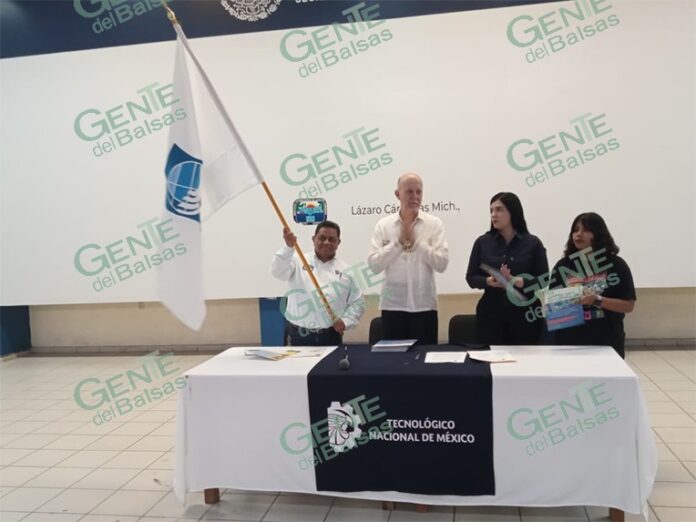 Dr. Felipe Palomares Salceda, Director del Tecnológico Nacional de México, Campus Lázaro Cárdenas, recibe la bandera de la Carta de la Tierra, tras firmar el documento para construcción de una sociedad justa y sostenible.
