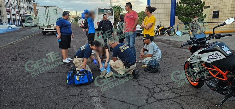 Zamora, Michoacán.- Una joven resultó con algunos golpes al ser atropellada por un motociclista, el cual derrapó y también sufrió algunas raspaduras, por fortuna ambos están fuera de peligro.