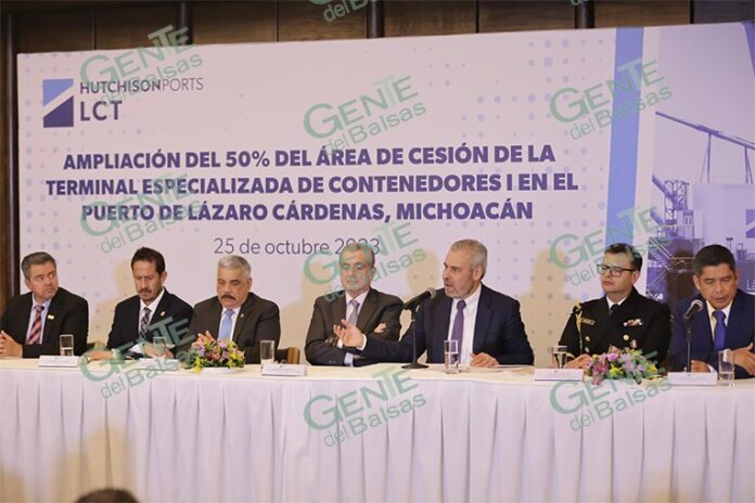 Ciudad de México, 26 de octubre de 2023.- El gobernador Alfredo Ramírez Bedolla y la trasnacional Hutchison Ports LCT, anunciaron una inversión superior a los 220 millones de dólares (más de 4 mil millones de pesos), para la ampliación de la terminal especializada de contenedores del puerto de Lázaro Cárdenas.
