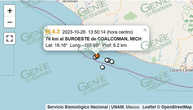Los datos oficiales del Servicio Sismológico Nacional indican que a las 13:50:14 horas de este jueves ocurrió un sismo de magnitud 4.3, cuyo origen fue referido a 76 kilómetros al suroeste de Coalcomán, a una profundidad de 6.2 kilómetros, en las coordenadas Latitud 18.16°, Longitud -103.48°, sitio ubicado mar adentro en el Océano Pacífico frente a la localidad costera de Maruata.