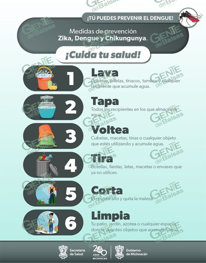 Morelia, Michoacán, 1 de mayo de 2024.- La prevención del dengue es responsabilidad de todas y todos, por ello la Secretaría de Salud de Michoacán (SSM) invita a la población a implementar en casa la estrategia lava, tapa, voltea y tira, para eliminar recipientes que puedan acumular agua de lluvia.