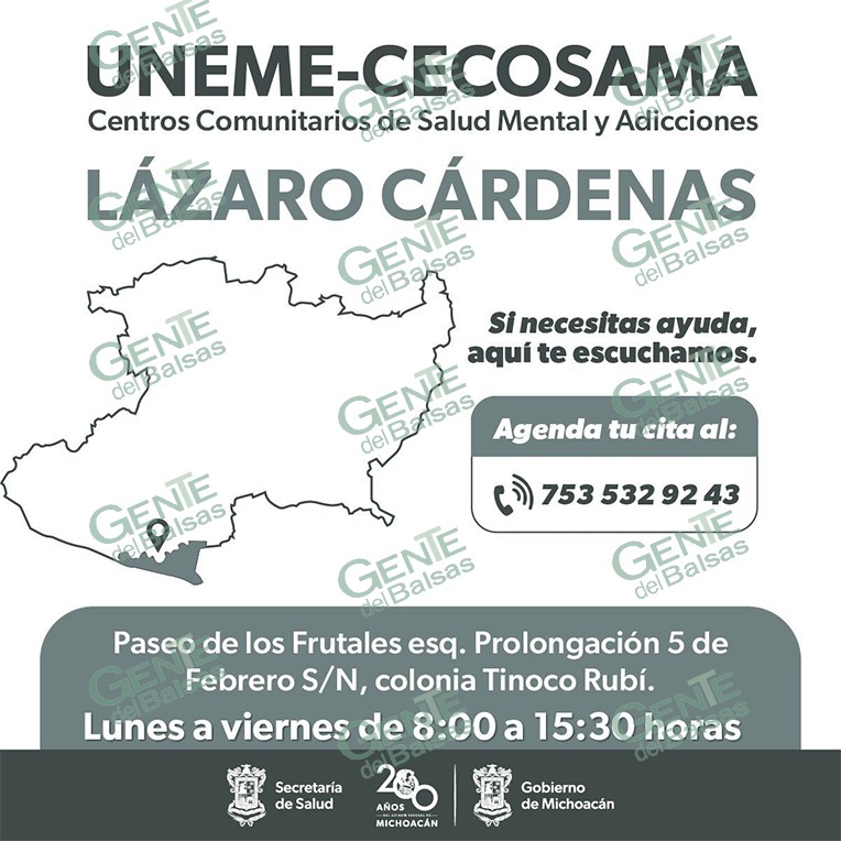 Estas unidades brindan servicio de lunes a viernes de 08:00 a 20:00 horas; además la Secretaría de Salud cuenta con las líneas telefónicas Hablemoos 443 314 1617 y 443 315 9037, disponibles las 24 horas del día los 365 días del año, para brindar apoyo necesario a quien lo requiera.