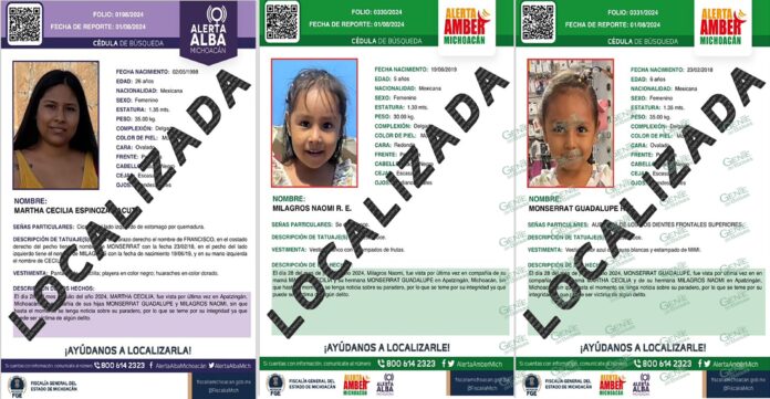 La FGE informó ayer haber localizado con vida a una madre y a sus dos menores hijas, que había sido reportadas como desaparecidas desde el 28 de julio en Apatzingán.