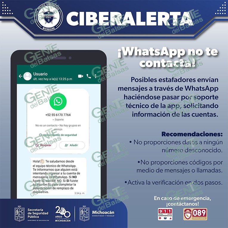 Morelia, Michoacán, 11 de agosto de 2024.- La Secretaría de Seguridad Pública (SSP), informa que derivado de los trabajos realizados por la Policía Cibernética, se detectó un posible fraude a través de la red social de WhatsApp, en donde se ha reportado el robo de cuentas.