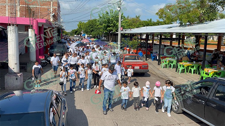Decenas de pobladores entre ellos niños, mujeres y adultos mayores, recorrieron las vialidades portando playeras blancas que en el frente tenían impresa la foto de “Tito Aguiñaga” y en la parte posterior una mano exprimiendo un limón del que escurre sangre.