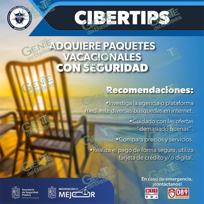 Morelia, Michoacán, 20 de enero del 2025.- ¿Planearás algún viaje? La Secretaría de Seguridad Pública (SSP) a través de la Policía Cibernética te recomienda seguir estos pasos para no comprar paquetes vacacionales en sitios falsos que pueden robar tu información digital o tu dinero.