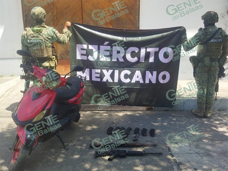 Militares del 82 Batallón de Infantería del Ejército Mexicano, aseguraron armas y una motoneta en la comunidad de Los Coyotes de este municipio.