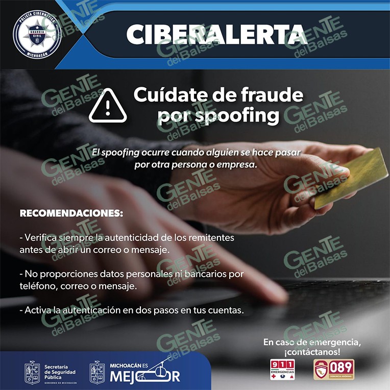 Morelia, Michoacán, 20 de agosto de 2025.- Las tareas de investigación e inteligencia que realiza el personal de la Secretaría de Seguridad Pública (SSP), han permitido descubrir una modalidad de fraude en línea llamado “spoofing”, que consiste en la suplantación de identidad de una persona o empresa.