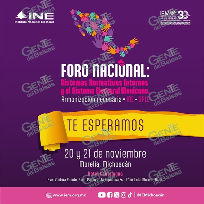 Morelia, Michoacán, 12 de noviembre de 2025. El Instituto Electoral de Michoacán (IEM) será sede del Foro Nacional “Sistemas Normativos Internos y el Sistema Electoral Mexicano. Armonización Necesaria INE–OPLE”, que se llevará a cabo los próximos 20 y 21 de noviembre en la ciudad de Morelia, Michoacán, con la asistencia de autoridades del Instituto Nacional Electoral (INE), del Tribunal Electoral del Poder Judicial de la Federación (TEPJF), de tribunales electorales locales y de los organismos públicos locales electorales (OPLEs) del país.