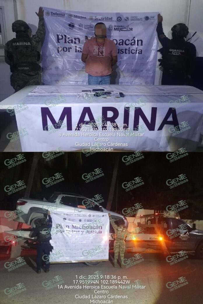 La Secretaría de Marina, a través de la  Armada de México, por conducto de la Décima Sexta Zona Naval, en coadyuvancia con la Guardia Civil, como parte del Plan Michoacán por la Paz y la Justicia, informó que el pasado lunes 01 de diciembre realizó la detención de un presunto transgresor de la ley, así como el aseguramiento de un arma corta, un cargador, cartuchos, ocho bolsas con sustancia blanca con características similares a las de la cocaína, además de un vehículo y equipo de comunicación, en esta ciudad y puerto.
