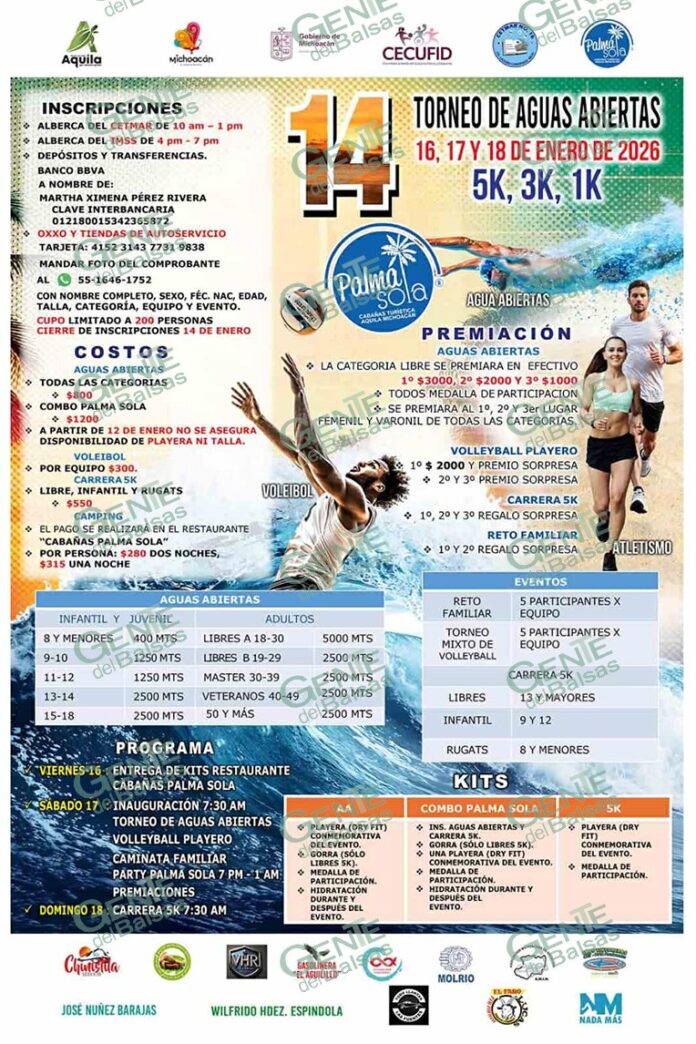 Pérez Bello invitó a ser parte, ya que además del torneo de aguas abiertas, se celebra caminata familiar de 5 y 3 kilómetros y deportes de playa, todos con premiación; que se suma a convivencias y fiesta familiar en un espacio seguro en la costa de Michoacán.