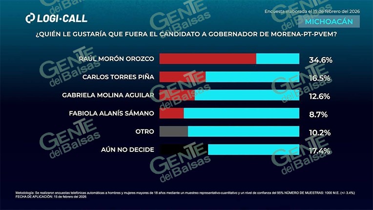 Morelia, Mich., a 17 de febrero de 2026.- En vísperas de que Morena defina a su Coordinador Estatal de Defensa de la Cuarta Transformación, el senador Raúl Morón Orozco se posiciona con una ventaja inalcanzable, según los datos más recientes de la encuestadora Logi-Call, que en su estudio de febrero lo coloca a la cabeza de las preferencias internas con un sólido 34.6%, cifra que duplica a la de su competidor más cercano.