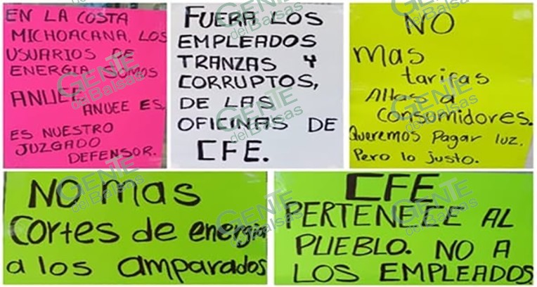 Los manifestantes a través de cartulinas expresaron sus demandas con los siguientes textos: En la costa michoacana los usuarios de energía somos ANUEE, ANUEE es nuestro es nuestro juzgado defensor; Fuera los empleados tranzas y corruptos de las oficinas de la CFE; No más tarifas altas a consumidores, queremos pagar luz pero lo justo; NO más cortes de energía a los amparados, CFE pertenece al pueblo, no a los empleados.