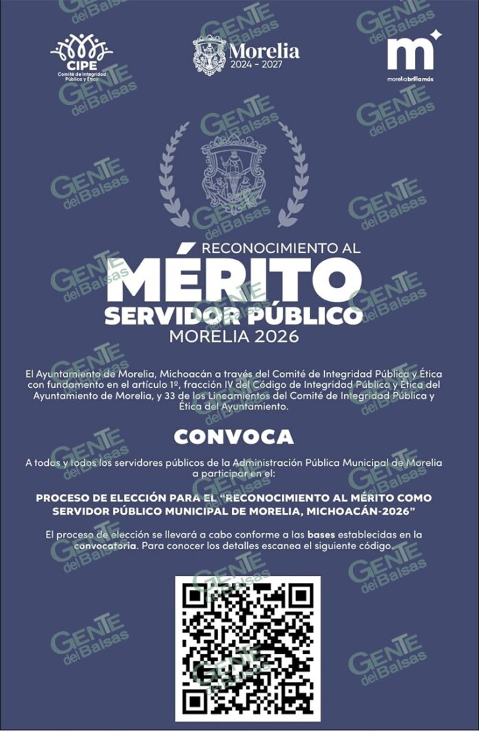 Morelia, Michoacán; 12 de abril de 2026.- Con el fin de honrar a aquellas personas que, desde la administración municipal, todos los días trabajan para el bien común de nuestra ciudad, el gobierno encabezado por el presidente Alfonso Martínez Alcázar convoca al “Reconocimiento al Mérito como Servidor Público Municipal de Morelia”.