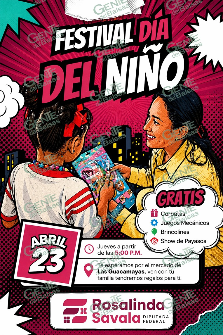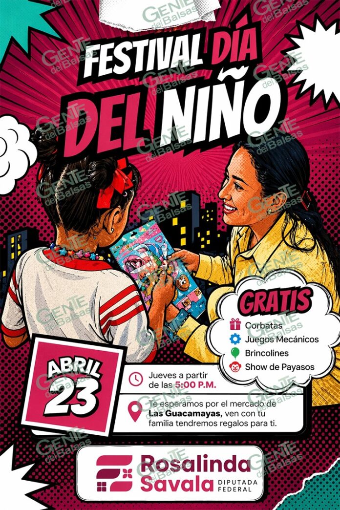 Con el objetivo de fomentar la convivencia familiar y brindar espacios de recreación para la niñez, la Diputada Federal Rosalinda Savala Díaz invita a las familias del municipio a participar en el Festival del Día del Niño, que se llevará a cabo este jueves 23 de abril en la tenencia de Las Guacamayas.
